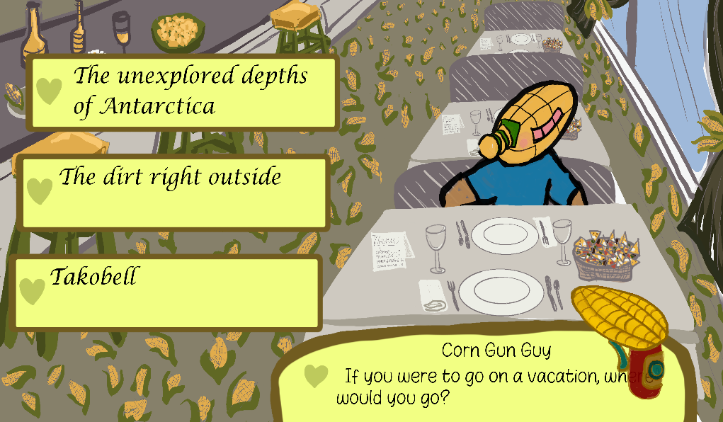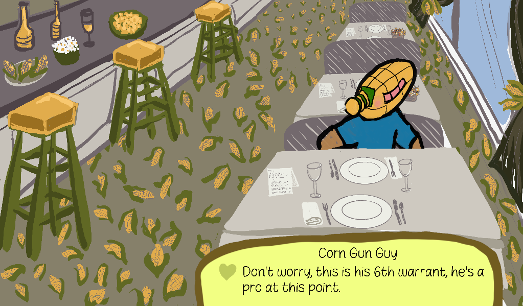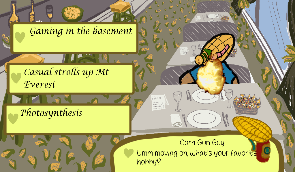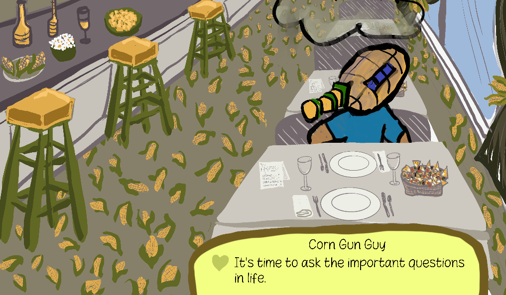 Date Corn Gun, the man of your dreams you found on Shuckr. If only this was a normal date, luckily your date is as unhinged as you are.